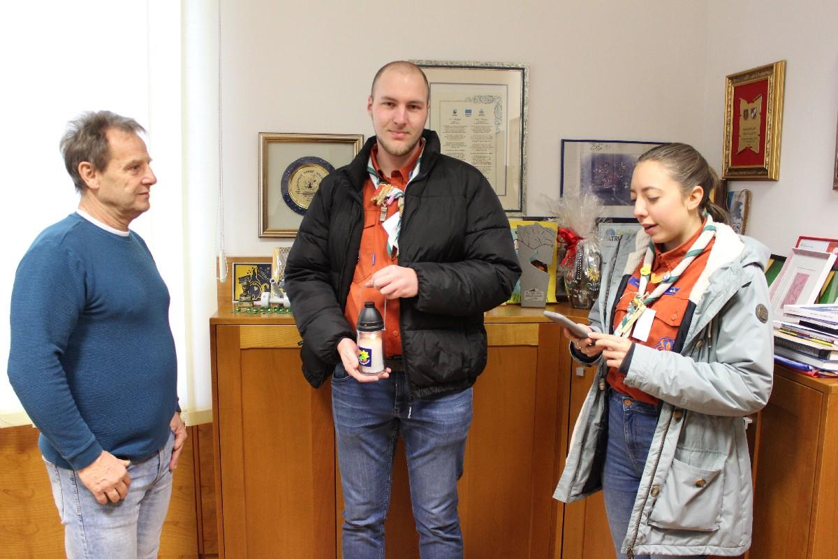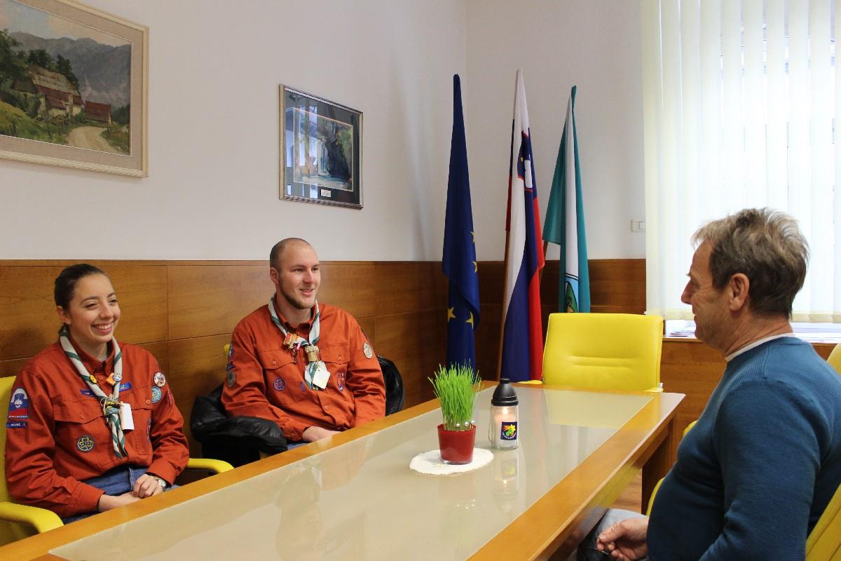 Župan Občine Bovec je z veseljem sprejel Luč miru iz Betlehema in se spustil v prijeten klepet s prinašalcema Luči. Med drugim sat županu povedala, da je trenutno v Stegu Bovec 1 kar 53 skavtinj in skavtov, pa tudi to, da jih je skorajda večina s Kobariškega.
