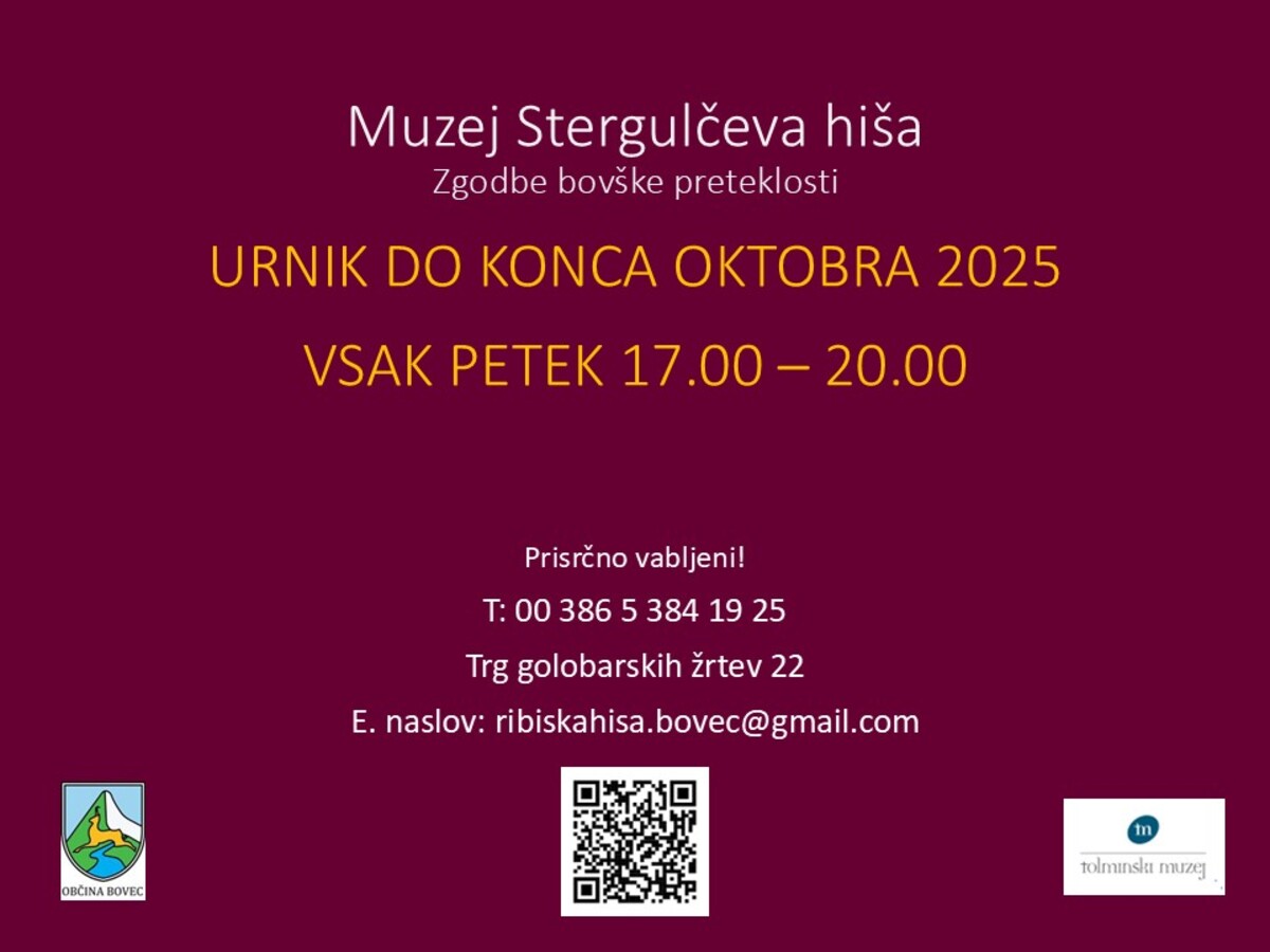 Muzej STERGULČEVA HIŠA – ZGODBE BOVŠKE PRETEKLOSTI, bo od danes, 5. 9. 2025, pa do zadnjega oktobra, odprt le ob petkih, od 17.00 do 20.00. Muzejska zbirka v Stergulčevi hiši pomeni izjemen doprinos v smislu kulturno – turistične ponudbe. Tolminski muzej je leta 2010 na pobudo Občine Bovec v Stergulčevi hiši odprl razstavo Zgodbe Stergulčeve hiše. Leta 2018 je bila razstava dopolnjena in delno preurejena v okviru projekta Razvoj novih produktov Muzeja Stergulčeva hiša, ki je uspešno kandidiral na razpisu LAS Dolina Soče. Pri projektu dopolnitve muzejske razstave sta sodelovala Občina Bovec in Tolminski muzej. Razstava Zgodbe bovške preteklosti, kot se po novem imenuje, obiskovalcu ponuja zanimive zgodbe tako Stergulčeve hiše kot tudi zgodbe, ki jih je pisala zgodovina na Bovškem skozi različna obdobja. Leta 2018 je bil na razstavo umeščen še prikaz arheološke podobe Bovškega.