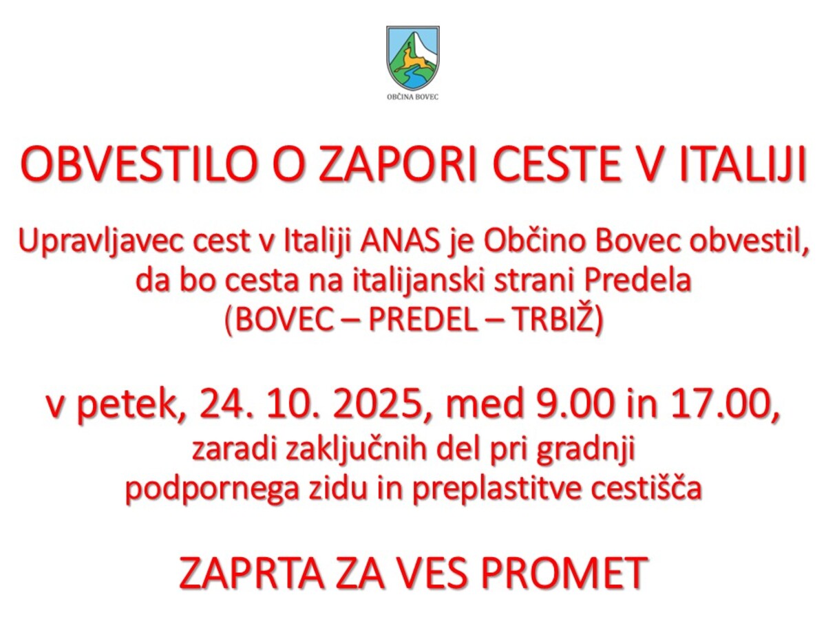 OBVESTILO O POPOLNI ZAPORI CESTE BOVEC – PREDEL – TRBIŽ