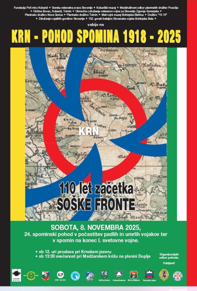 Fundacija Poti miru Kobarid, Gorska reševalna zveza Slovenije, Kobariški muzej, Meddruštveni odbor planinskih društev Posočja, Občine Bovec, Kobarid, Tolmin, Območno združenje veteranov vojne za Slovenijo Zgornja Gorenjska, Planinsko društvo Nova Gorica, Planinsko društvo Tolmin, Mali vojni muzej Bohinjska Bistrica, Društvo “13 13”, Združenje vojaških gornikov Slovenije, 132. gorski bataljon Slovenske vojske Bohinjska Bela, vabijo na 24. spominski pohod v počastitev padlih in umrlih vojakov ter spomin na konec I. svetovne vojne.
