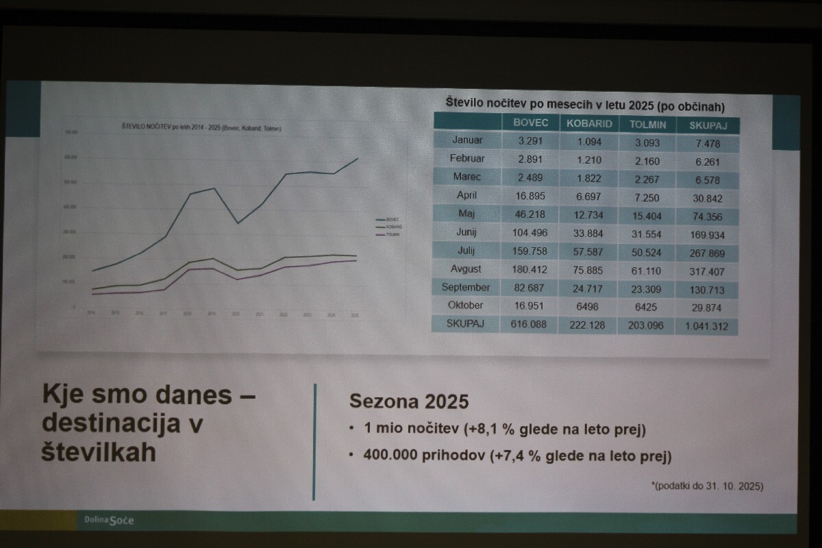Po uvodnih pozdravih so sledile predstavitve zatečenega stanja in želenega razvoja turizma v prihodnosti, primerov dobrih praks, za zaključek pa so izvedli okroglo mizo. Kot so zapisali pri RRA Posoški razvojni center, so bili v ospredju 𝐬𝐨𝐝𝐨𝐛𝐧𝐢 𝐭𝐫𝐞𝐧𝐝𝐢 𝐯 𝐭𝐮𝐫𝐢𝐳𝐦𝐮, pomen 𝐩𝐨𝐯𝐞𝐳𝐨𝐯𝐚𝐧𝐣𝐚 𝐦𝐞𝐝 𝐫𝐞𝐠𝐢𝐣𝐚𝐦𝐢 ter 𝐝𝐯𝐢𝐠 𝐝𝐨𝐝𝐚𝐧𝐞 𝐯𝐫𝐞𝐝𝐧𝐨𝐬𝐭𝐢 𝐥𝐨𝐤𝐚𝐥𝐧𝐞 𝐩𝐨𝐧𝐮𝐝𝐛𝐞. Poudarjeno je bilo, da prihodnost turizma temelji na sodelovanju, inovativnih pristopih in spoštovanju prostora ter lokalne skupnosti. Okrogla miza je ponudila ideje o 𝐬𝐤𝐮𝐩𝐧𝐞𝐦 𝐫𝐚𝐳𝐯𝐨𝐣𝐮 𝐜̌𝐞𝐳𝐦𝐞𝐣𝐧𝐢𝐡 𝐩𝐫𝐨𝐣𝐞𝐤𝐭𝐨𝐯, 𝐮𝐫𝐚𝐯𝐧𝐨𝐭𝐞𝐳̌𝐞𝐧𝐣𝐮 𝐭𝐮𝐫𝐢𝐬𝐭𝐢𝐜̌𝐧𝐢𝐡 𝐭𝐨𝐤𝐨𝐯 in 𝐮𝐬𝐭𝐯𝐚𝐫𝐣𝐚𝐧𝐣𝐮 𝐚𝐯𝐭𝐞𝐧𝐭𝐢𝐜̌𝐧𝐢𝐡 𝐝𝐨𝐳̌𝐢𝐯𝐞𝐭𝐢𝐣, ki ohranjajo naravo in kakovost življenja domačinov. Ob zaključku je Tadej Cotič iz Združenja sobodajalcev Slovenije povzel ključne novosti, ki jih prinaša 𝐧𝐨𝐯 𝐙𝐚𝐤𝐨𝐧 𝐨 𝐠𝐨𝐬𝐭𝐢𝐧𝐬𝐭𝐯𝐮.