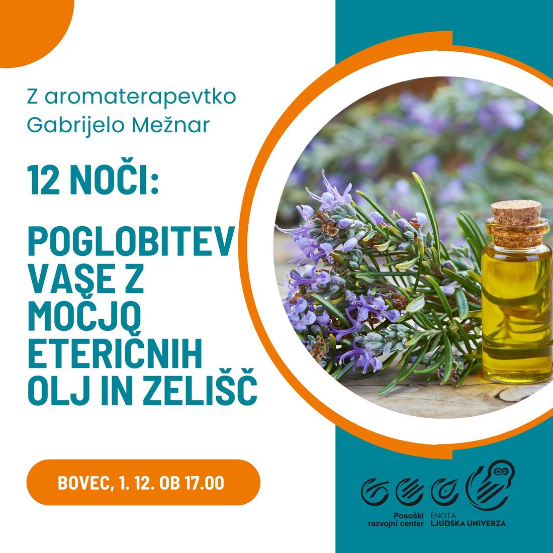 Čas med 25. decembrom in 6. januarjem je idealen za umiritev, refleksijo in povezovanje s samim seboj. Namesto hitenja in stresa si privoščite trenutke tišine in notranjega miru. Z eteričnimi olji in zelišči boste ustvarili svoj osebni ritual, ki vas bo vodil skozi 12 dni introspektive. Vzeli si boste čas zase, se naučili izbranih tehnik aromaterapije in s seboj odnesli znanje, ki vam bo služilo tudi po praznikih.