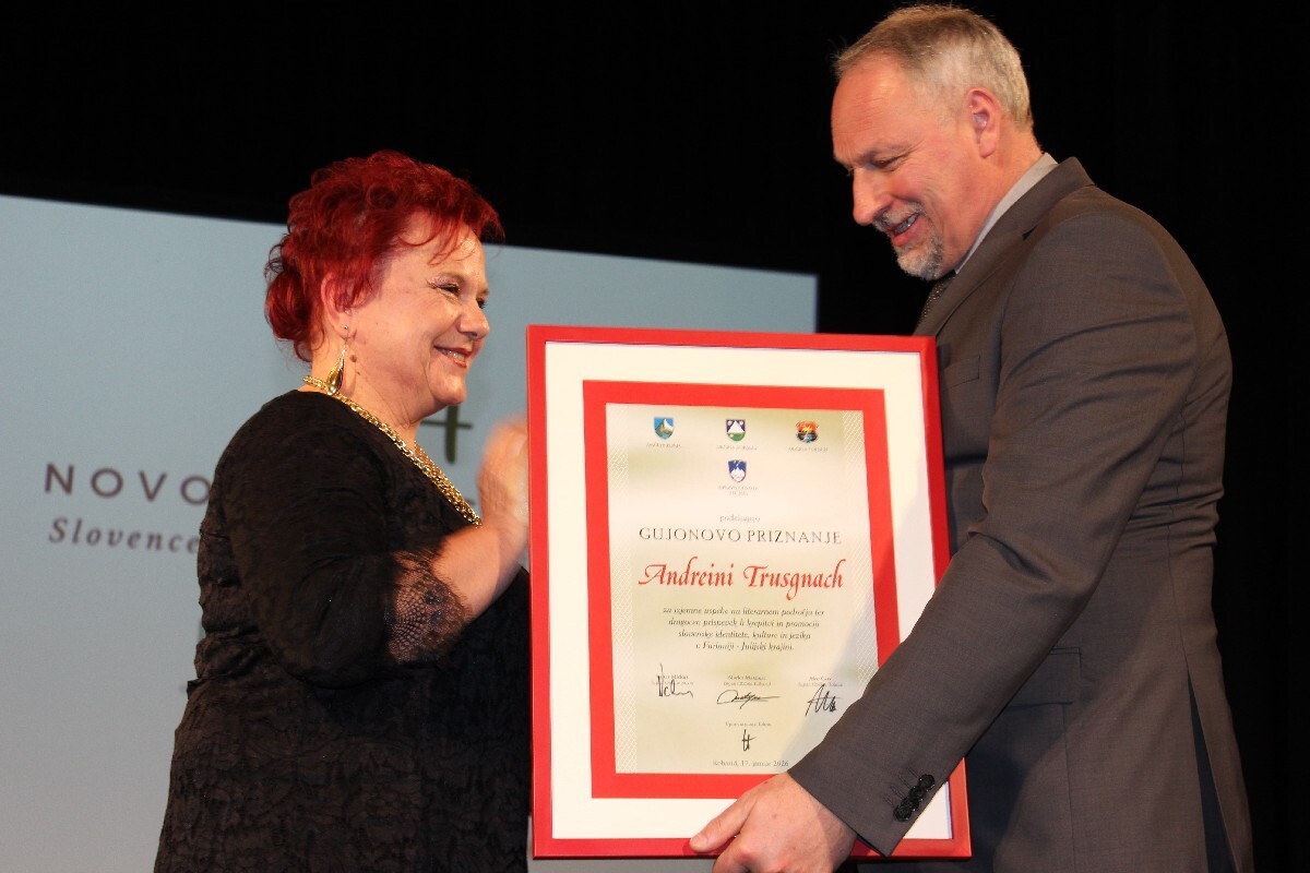 Andreina Trusgnach, ki ga je prejela za izjemne literarne dosežke ter dragocen in vztrajen prispevek k ohranjanju in uveljavljanju slovenskega jezika in kulture v Benečiji. Njeno ustvarjanje v slovenskem beneškem narečju predstavlja zavesten in pogumen odgovor na postopno izginjanje jezikovne raznolikosti v Videnski pokrajini. Njena poezija, proza in besedila popevk so bila večkrat nagrajena ter objavljena v številnih publikacijah v Sloveniji in Italiji, s čimer pomembno prispevajo k prepoznavnosti Beneških Slovencev v širšem prostoru.