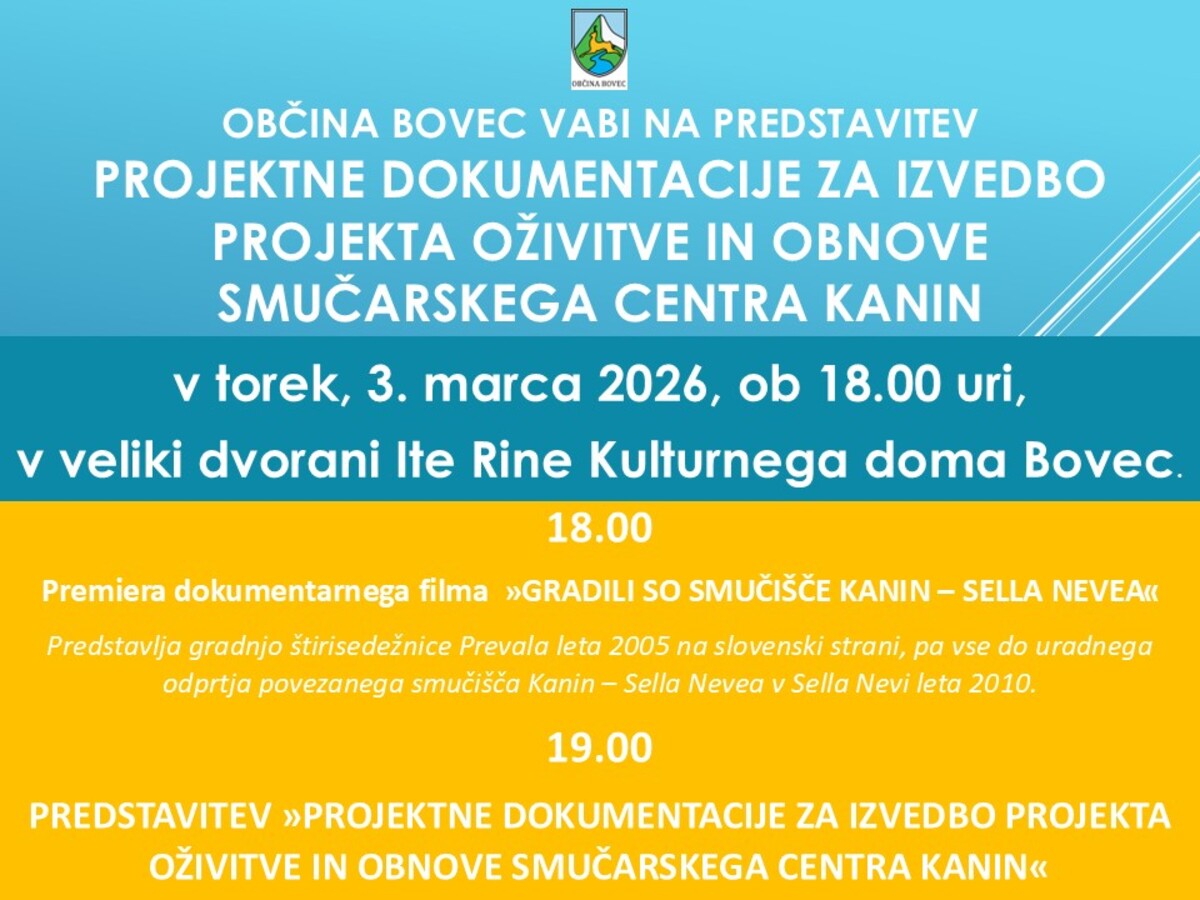 Občina Bovec kot organizator z veseljem in vljudno vabi na predstavitev PROJEKTNE DOKUMENTACIJE ZA IZVEDBO PROJEKTA OŽIVITVE IN OBNOVE SMUČARSKEGA CENTRA KANIN«, ki bo v torek, 3. marca 2026, ob 18.00, v dvorani Ite Rine Kulturnega doma Bovec.