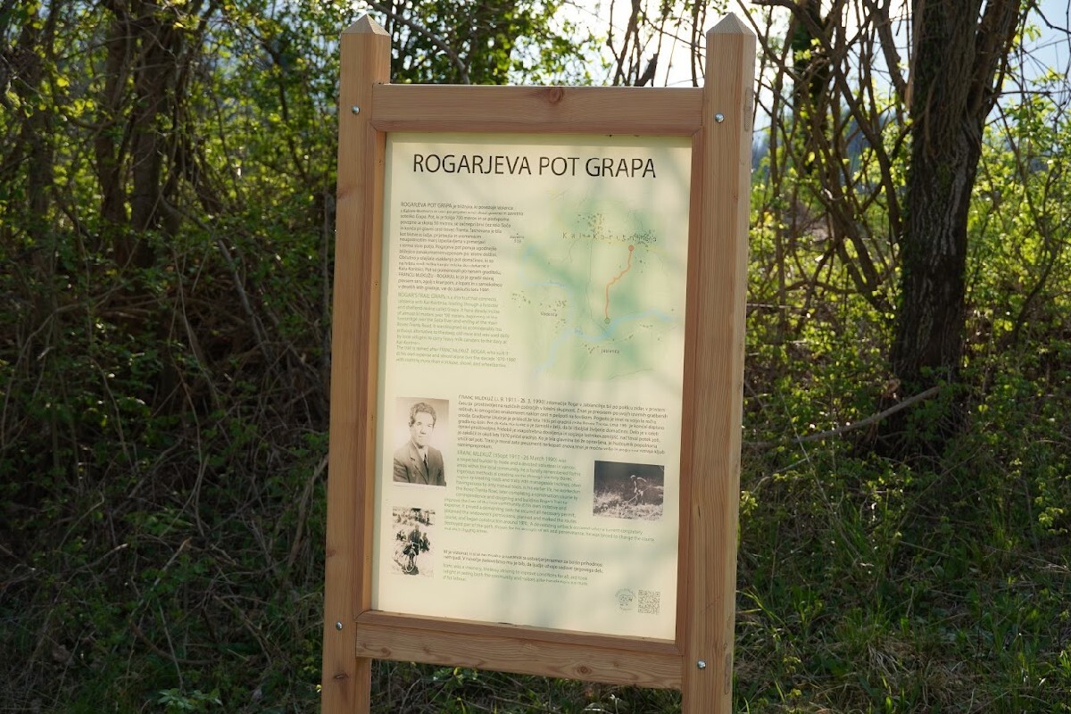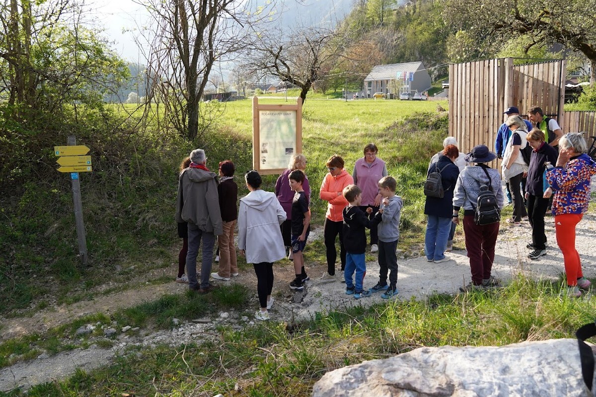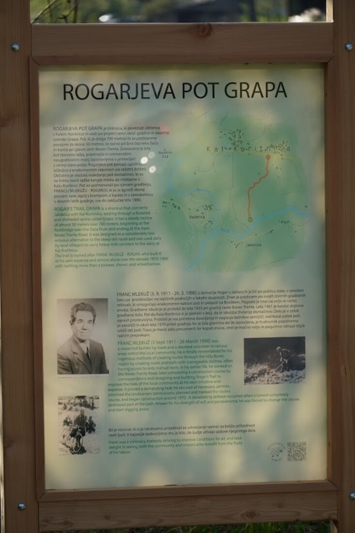 V soboto, 11. aprila 2026, je na Kal Koritnici (nasproti Ribiške hiše) v prijetnem in sproščenem vzdušju potekala prireditev ob postavitvi spominske table na Rogarjevi poti. V lepem vremenu se je zbralo lepo število obiskovalcev, predvsem domačinov in ljubiteljev lokalne dediščine, ki so s svojo prisotnostjo počastili pomemben prispevek posameznika k razvoju kraja. Občino Bovec je na prireditvi zastopal podžupan Erik Cuder. Pobudnik postavitve table je bil Peter Cuder, ki je na prireditvi spregovoril o življenju in delu Franca Mlekuža – Rogarja ter osvetlil pomen njegovega dela za domače okolje. Rogarjeva pot, ki vodi skozi Grapo od Jablanc do Kala - Koritnice, je približno 700 metrov dolga bližnjica z več kot 50 višinskimi metri vzpona. Nastala je z namenom olajšati vsakodnevne poti domačinov med krajema, predvsem do trgovine in mlekarne, danes pa predstavlja tudi simbol vztrajnosti in predanosti. Pot je dobila ime po Francu Mlekužu, po domače Froncu Rogarju (1911–1990) iz Jablanc. Bil je samouk in predan graditelj, ki je svoje znanje začel pridobivati že leta 1935 pri gradnji ceste Bovec–Soča–Trenta, kasneje pa ga je nadgradil z dopisno izredno gradbeno šolo. Ljudje ga najbolj pomnijo po njegovi samosvoji in požrtvovalni gradnji cest in poti na Bovškem. Rogarjevo pot skozi Grapo je začel graditi okoli leta 1970 in jo večinoma zgradil sam – s krampom, lopato in samokolnico. Delo je trajalo kar deset let, pri čemer so ga ovirale tudi naravne ujme; hudournik mu je del poti uničil, zato jo je moral na novo trasirati. Kljub izjemnemu trudu za svoje delo ni prejel plačila ali posebnega priznanja, zato ima postavitev spominske table še toliko večji pomen.