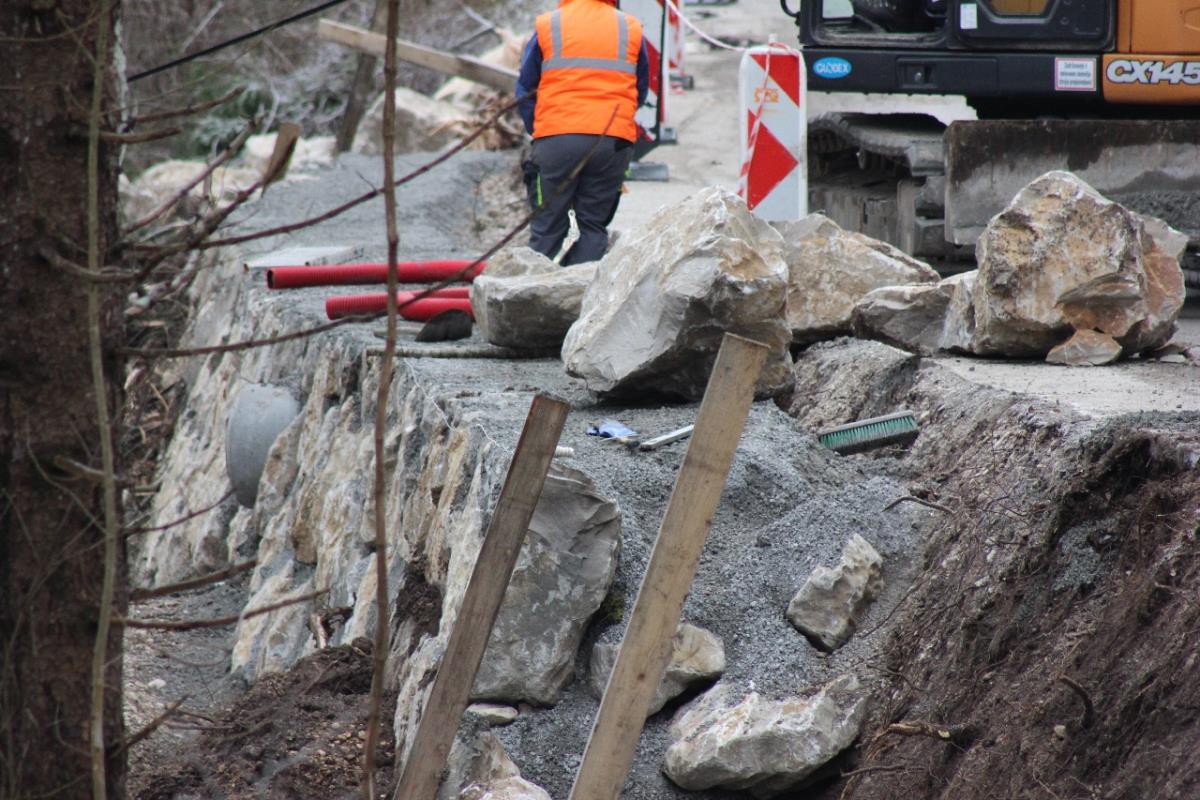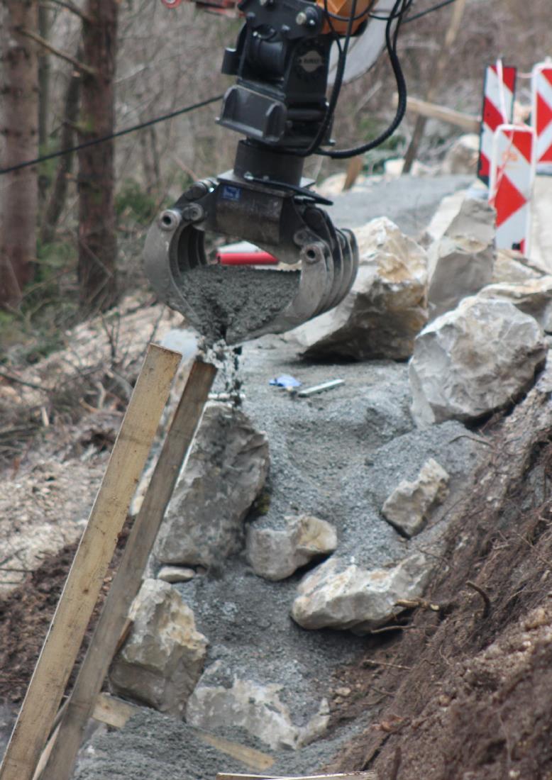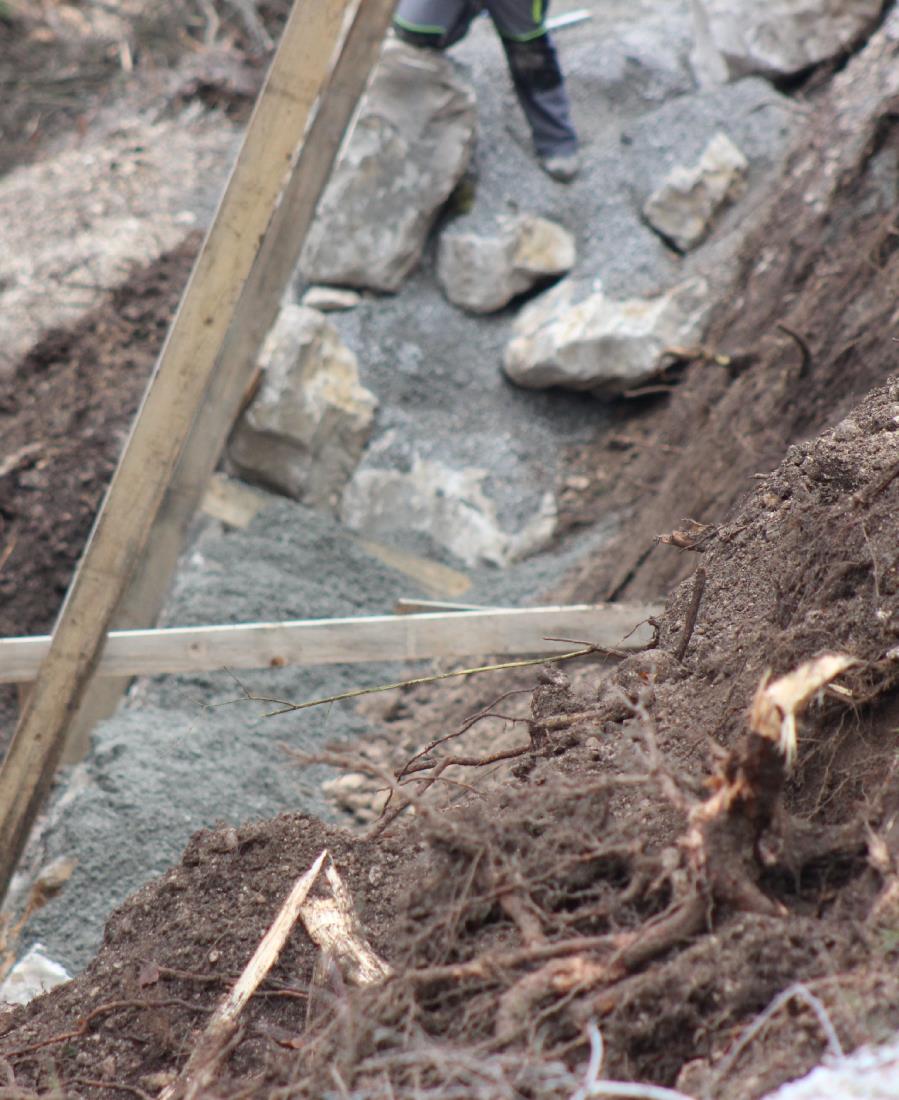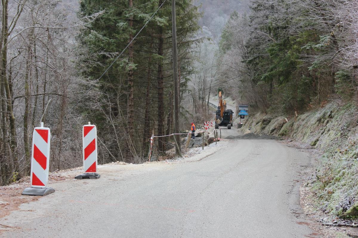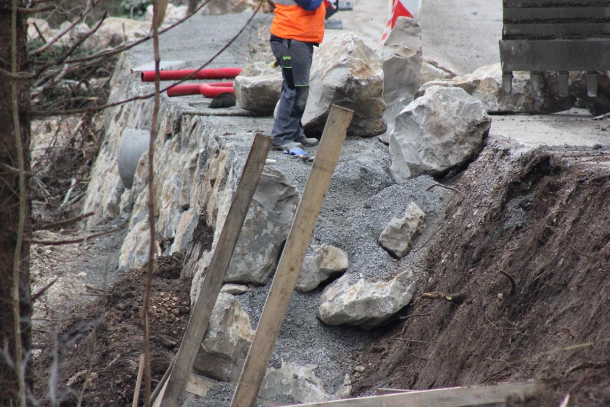 Gradnja dveh kamnito betonskih zložb dolžine 91 m in 125 m na javni poti Bovec – Vodenca, ki je del projekta rekonstrukcije te javne poti, lepo napreduje.