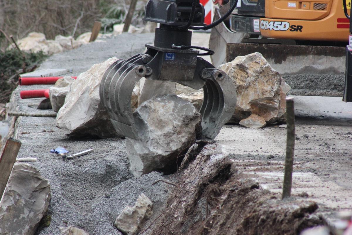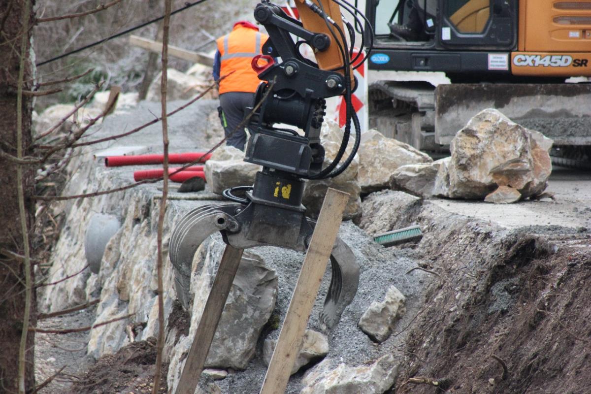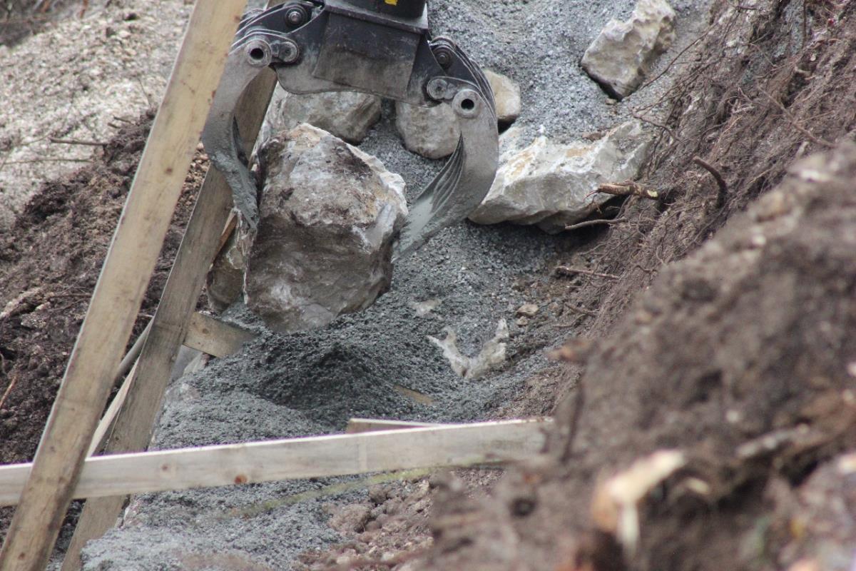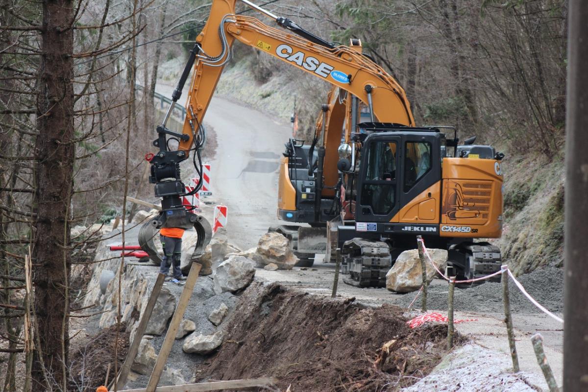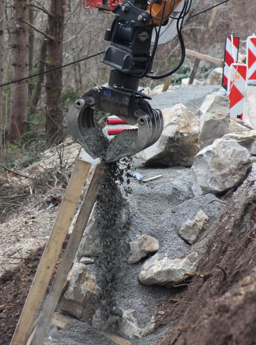Gradnja dveh kamnito betonskih zložb dolžine 91 m in 125 m na javni poti Bovec – Vodenca, ki je del projekta rekonstrukcije te javne poti, lepo napreduje.