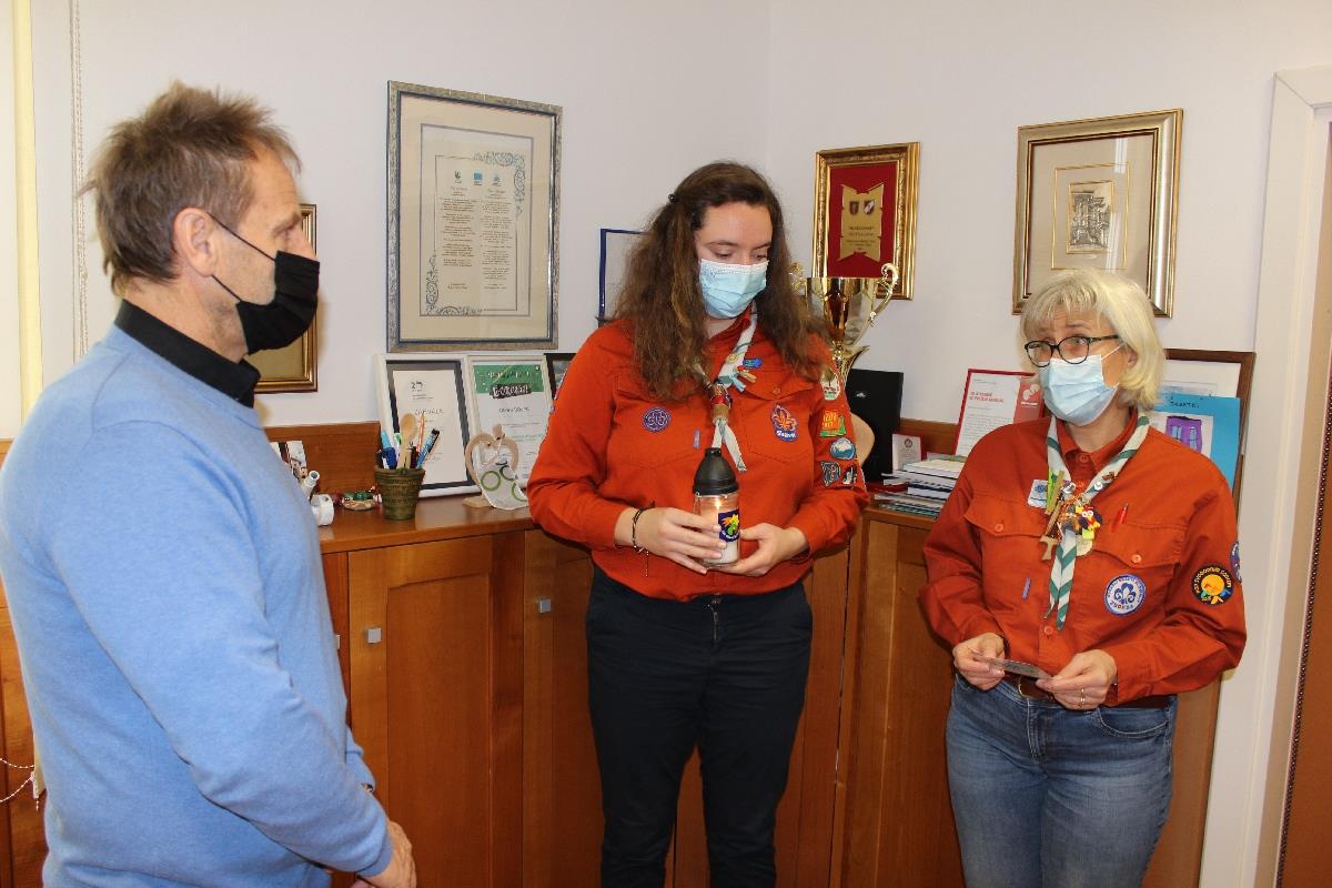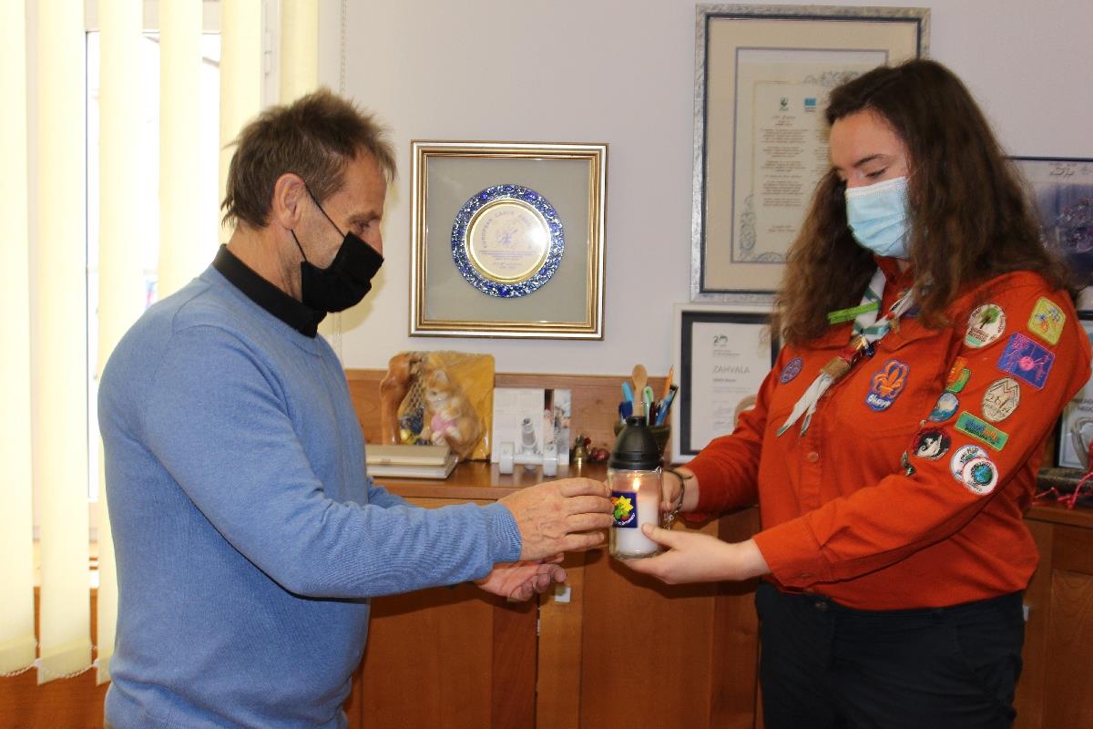 Župan je sprejel Betlehemsko luč in se skavtinjama zahvalil z besedami: