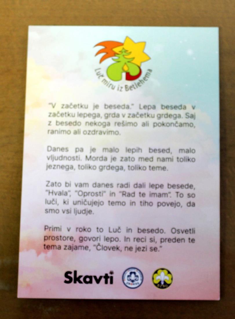 “V začetku je beseda.” Lepa beseda v začetku lepega, grda v začetku grdega. Saj z besedo nekoga rešimo ali pokončamo, ranimo ali ozdravimo. Danes pa je malo lepih besed, malo vljudnosti. Morda je zato med nami toliko jeznega, toliko grdega, toliko teme. Zato bi vam danes radi dali lepe besede, “Hvala”, “Oprosti” in “Rad te imam”. To so luči, ki uničujejo temo in tiho povejo, da smo vsi ljudje. Primi v roko to Luč in besedo. Osvetli prostore, govori lepo. In reci si, preden te tema zajame, »Človek, ne jezi se.”