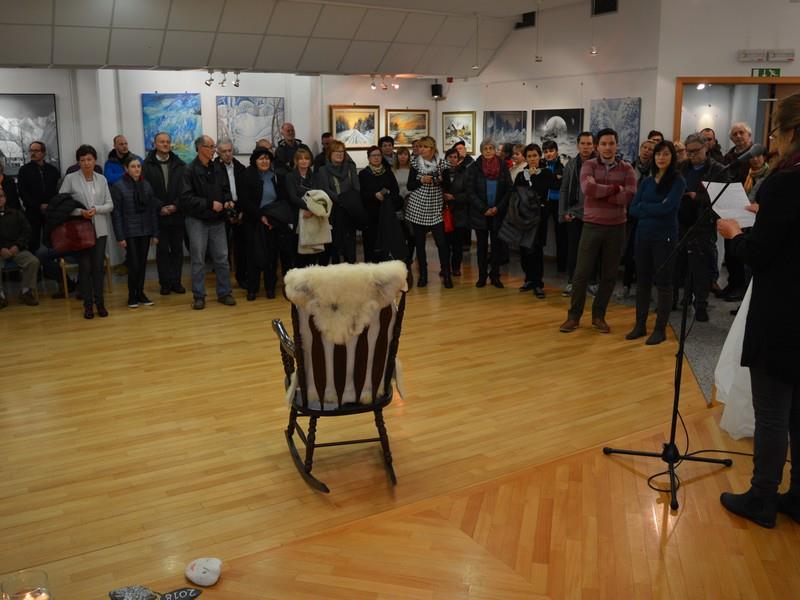 »Še enkrat nam je uspelo pripraviti razstavo z bogato bero slikarskih in fotografskih del, ob tem pa se želim zahvaliti vsem, ki so prinesli svoja dela, oziroma vsem, ki so kakorkoli prispevali, da je prišlo do tega dogodka. Predvsem pa se želim zahvaliti Občini Bovec in županu Valterju Mlekužu za podporo, Mlekužu pa tudi za današnjo udeležbo ob odprtju razstave. Ob božično-novoletnem času se pogosto družimo, ker nas druži želja po več svetlobe v našem življenju in si ob simboličnem ognjišču tako že iz pradavnine pripovedujemo zgodbe. Ker je to čas tišine, skrivnosti, čudežev….in ker biti skupaj, pomeni moč. Tiho upamo, da nas bo nekje nekdo slišal in uslišal. Zgodba današnjega večera je bela. Lahko je to pravljica, lahko skrivnost, lahko je čas, lahko je vezenina. Zgodbo o beli smo ustvarjali in jo predstavljamo v slikah, fotografijah in modni kreaciji. Zakaj pa bela? Ker ni in je več kot barva, ker si slikar ne predstavlja barvne palete brez nje, ker bela pomeni svetlobo in predmetom na podobah daje telesnost, otipljivost,« je med drugim povedala Slavica Mlekuž.