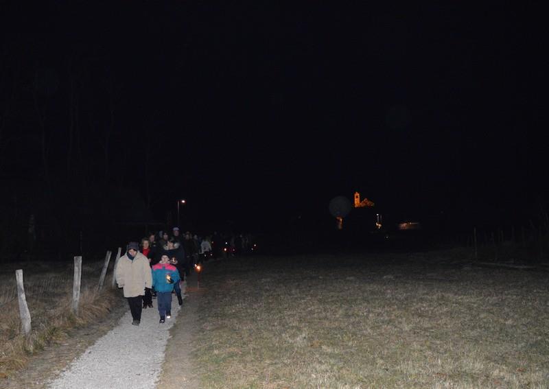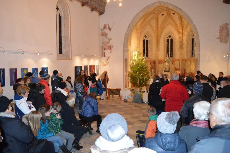 Potem pa je sledil sprehod z lanternami do cerkvice Device Marije v Polju, kjer so udeleženci dočakali tudi prihod Jožefa in Marije, ki sta ju uprizorila člana Gledališke skupine Bovec David Štulc Zornik in Nika Gaberšček, ob prepevanju božičnih pesmi Cerkvenega pevskega zbora Tolmin pa se je letošnji Božični dogodek tudi sklenil.