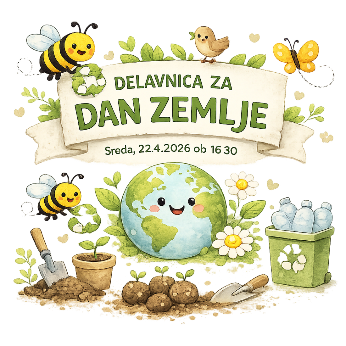 V sredo, 22. 4. 2026 ob 16.30 vabimo otroke (od 1. razreda dalje) na zabavno in poučno ustvarjalno delavnico "RECIKLIRAJ-USTVARI-POSADI" ob Dnevu Zemlje.