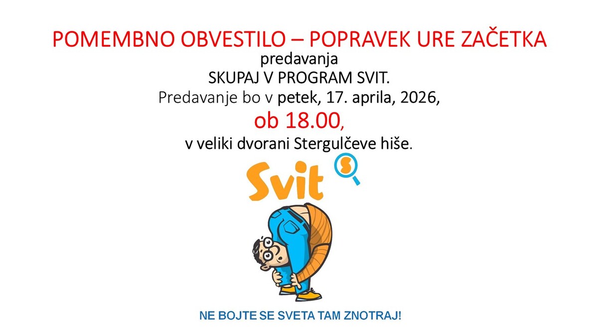 OBVEŠČAMO VAS, da je zaradi logističnih zadev ura začetka predavanja SKUPAJ V PROGRAM SVIT, ki bo v petek, 17. 4. 2026, v Stergulčevi hiši PRESTAVLJENA NA 18.00 (in ne ob 18.30).
